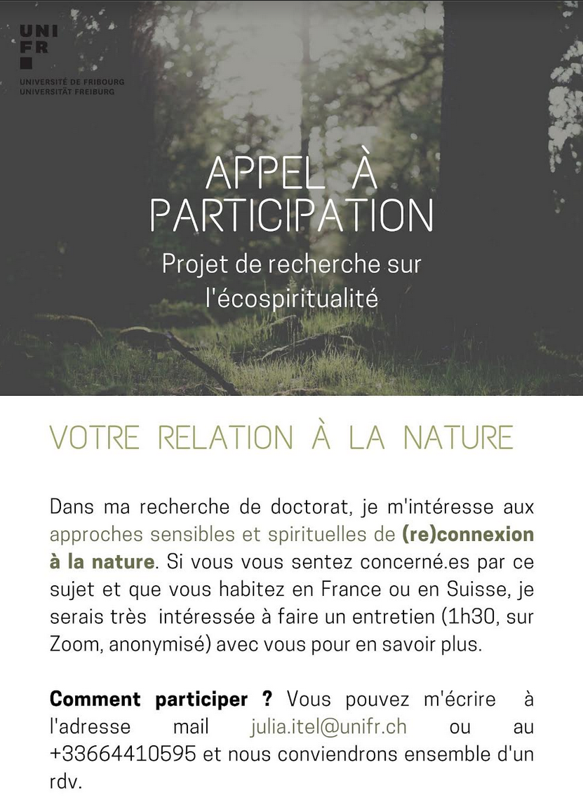 Doctorante en Sciences des religions (Université de Fribourg), je consacre depuis 5 ans mes recherches à la spiritualité et à la quête de sens de personnes qui oeuvrent pour le respect du vivant. Autrice de "Spiritualité et société durable", je prépare actuellement une thèse sur l'écospiritualité.
